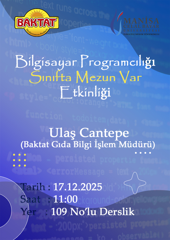 Manisa Celal Bayar Üniversitesi Turgutlu Meslek Yüksekokulu Bilgisayar Teknolojileri Bölümü, anlamlı bir etkinliğe ev sahipliği yaptı. Öğr. Gör. Dr. Ali Osman Gökcan tarafından 17 Aralık 2025 tarihinde düzenlenen “Sınıfta Mezun Var” etkinliği kapsamında, 2021-2022 eğitim-öğretim yılı mezunlarından Ulaş Cantepe öğrencilerle bir araya geldi.