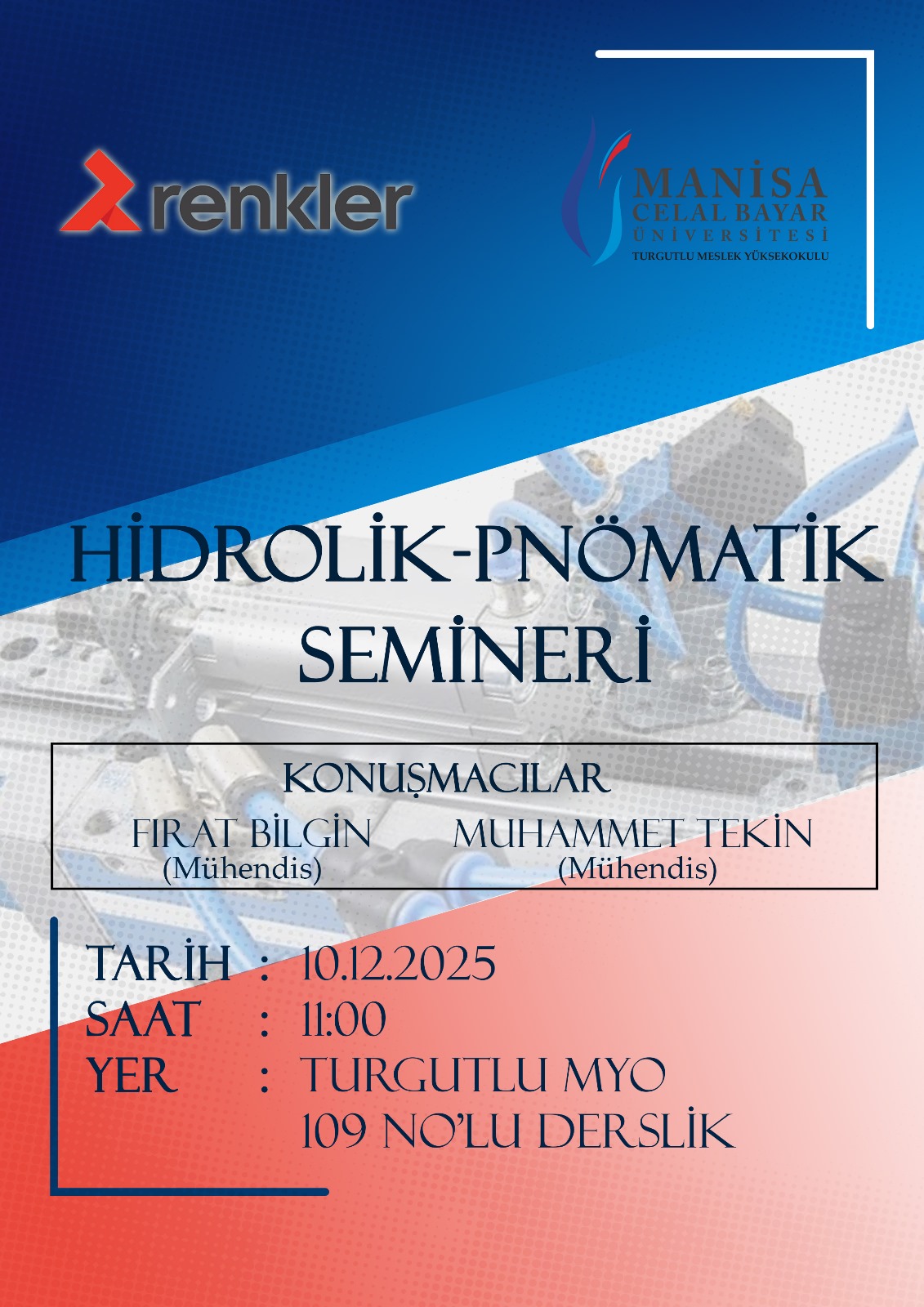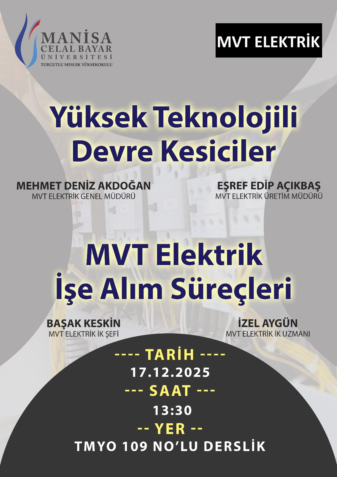 Turgutlu Meslek Yüksekokulu Elektrik ve Enerji Bölümü, 2025 yılı Aralık ayını iki dev organizasyonla kapatarak öğrencilerimizi sektörün lider firmalarıyla buluşturdu. Renkler Makina ve MVT Elektrik iş birliğiyle gerçekleştirilen seminerler, teorik eğitimi saha tecrübesiyle taçlandırdı.